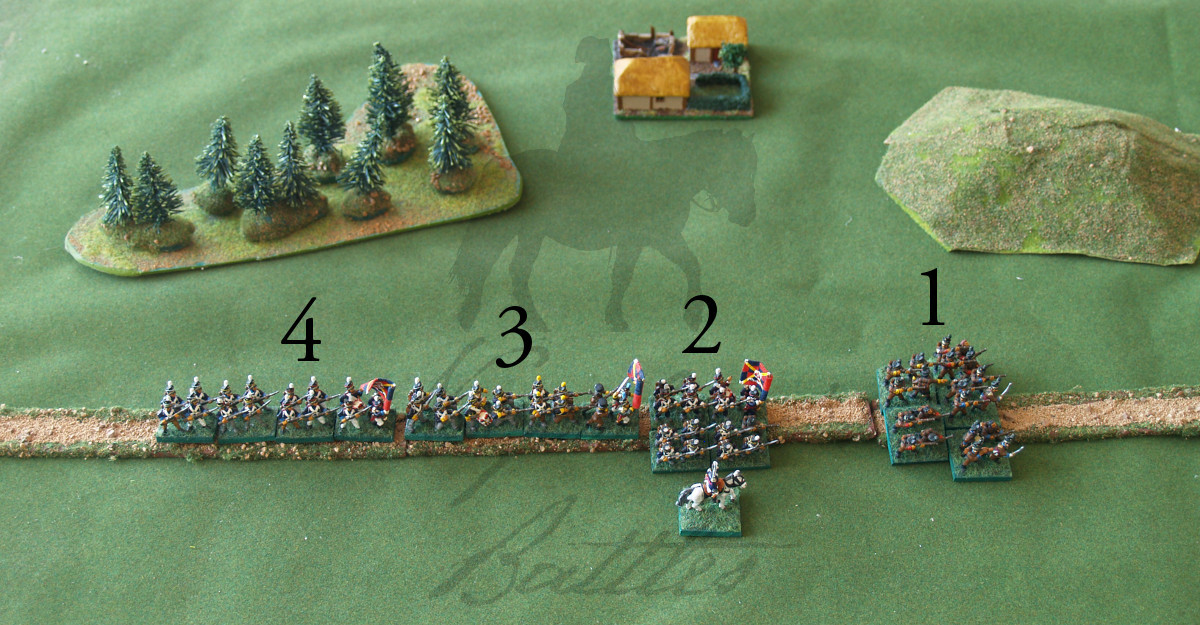 Second turn: All units are inside the span of their commander, so all them can move normally (applying the usual rules for command and control). Units 1 & 2 can make way by moving (they already are in column formation), while units 3 & 4 can change formation without any special rule for continuous columns.